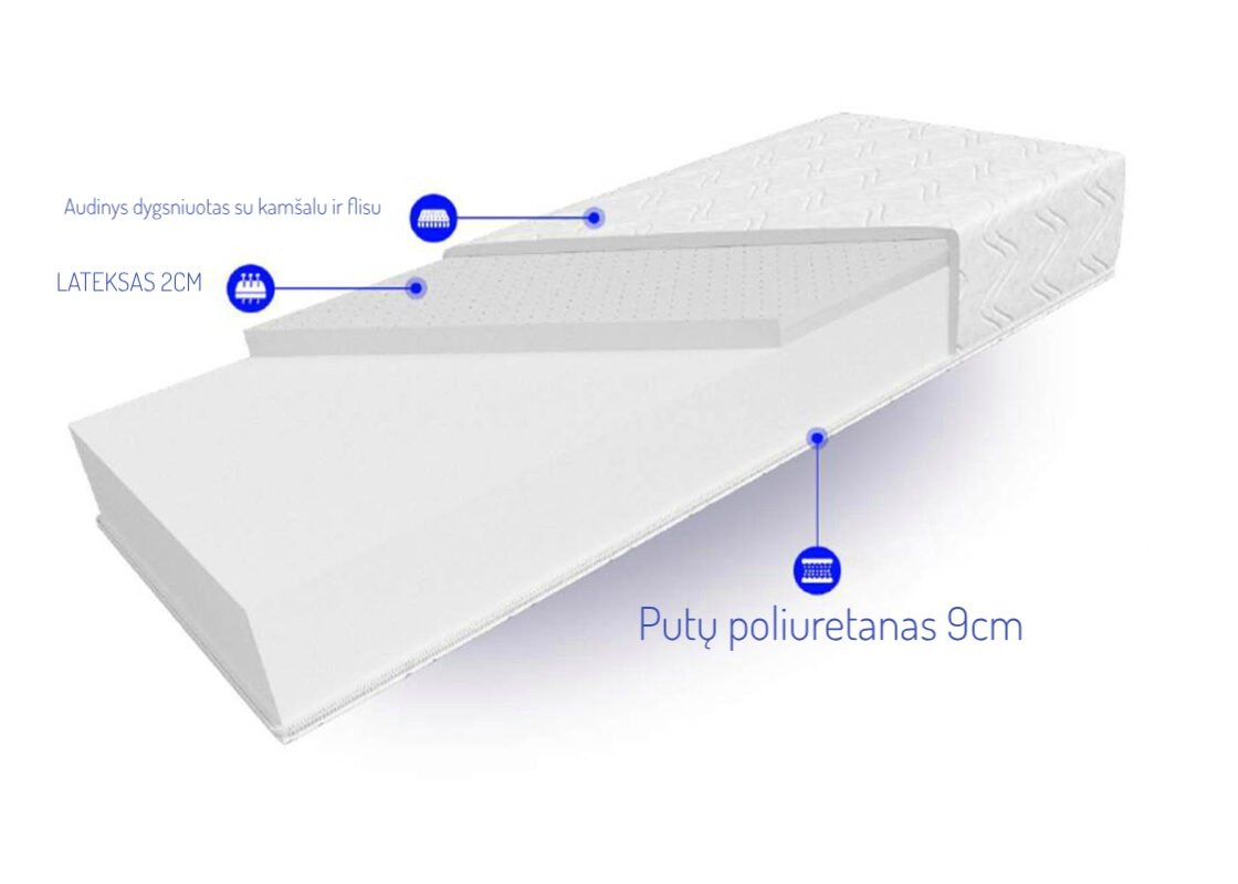- Poliuretano porolonas: atsparus deformacijoms, hipoalerginis, užtikrina tinkamą oro pralaidumą