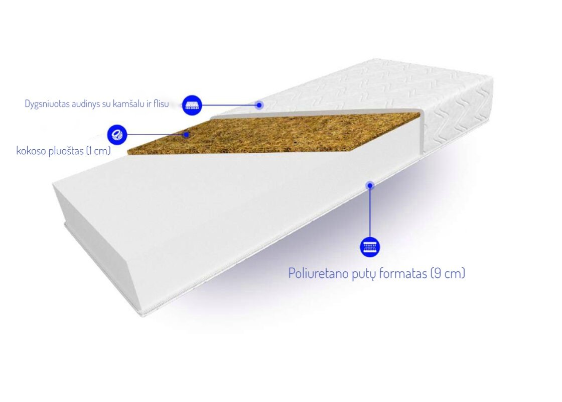 Putų struktūra yra hipoalerginė, užtikrinanti sveikesnę miego aplinką. - Kokoso plaušo sluoksnis: pagamintas iš natūralių kokoso pluoštų, 100% ekologiškas, turintis antigrybelinių ir hipoalerginių savybių.
