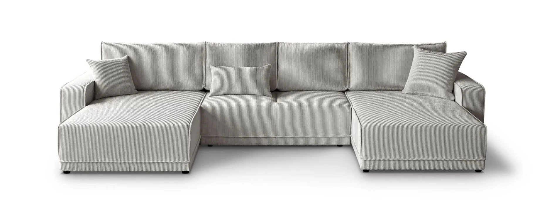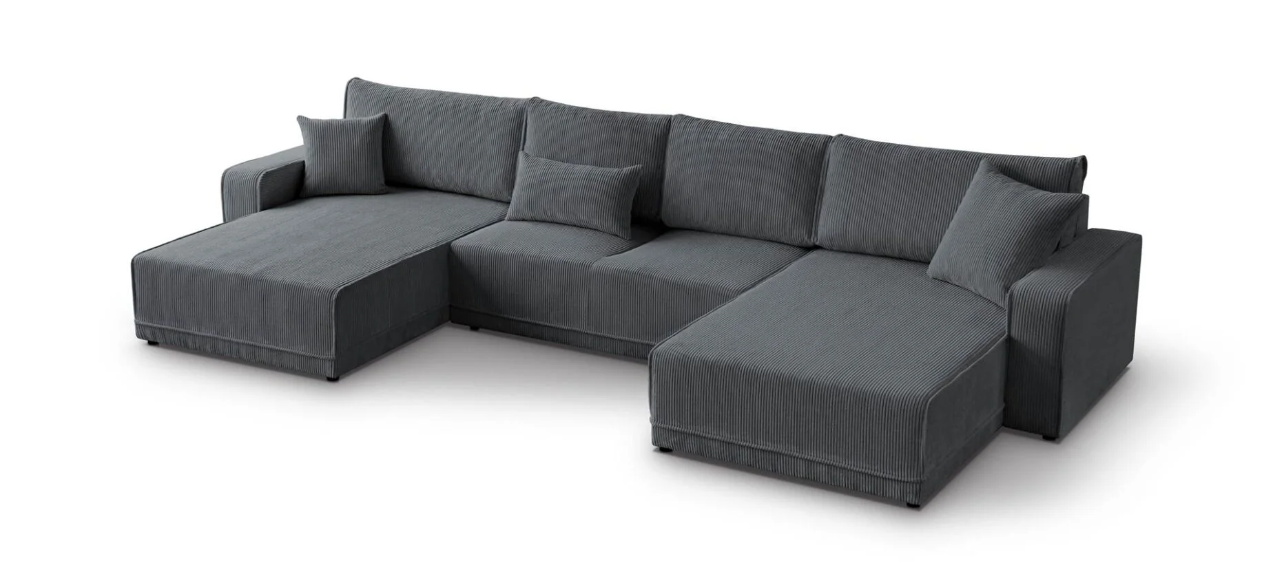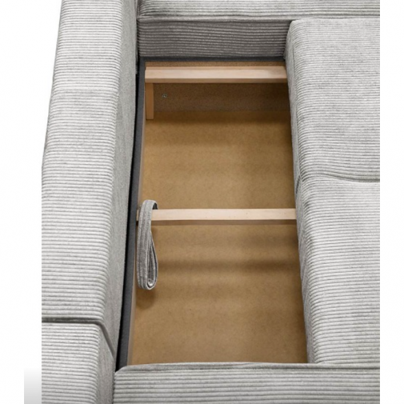 Minkštas kampas LIVANO U – modernus, išskirtinio dizaino kampas su miego funkcija ir didele patalynės dėže. Jo stambaus veliūrinio audinio struktūra suteikia šilumos ir jaukumo jausmą, o erdvus dizainas leidžia patogiai ilsėtis visai šeimai.