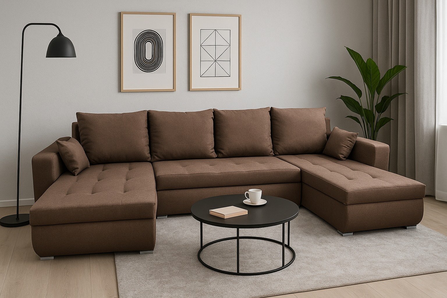 Moderni kampinė sofa VALETTA U puikiai atrodo erdviame svetainės interjere, jos forma puikiai dera tiek moderniame, tiek klasikiniame dizaine. Atlošą sudaro minkštos pagalvės, o patogūs porankiai ir platus gultas suteikia maksimalų komfortą poilsiui. Nepakeičiamas šios sofos privalumas – didelė patalynės dėžė, kurioje patogiai paslėpsite pagalves, antklodes ar kitus reikalingus daiktus.