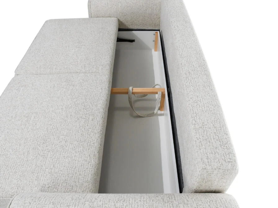 Sofa turi integruotą patalynės dėžę, kurioje patogu laikyti patalynę, pagalves ar kitus daiktus. Miego funkcija leidžia lengvai ir greitai paversti sofą į lovą, taip maksimaliai išnaudojant erdvę namuose.