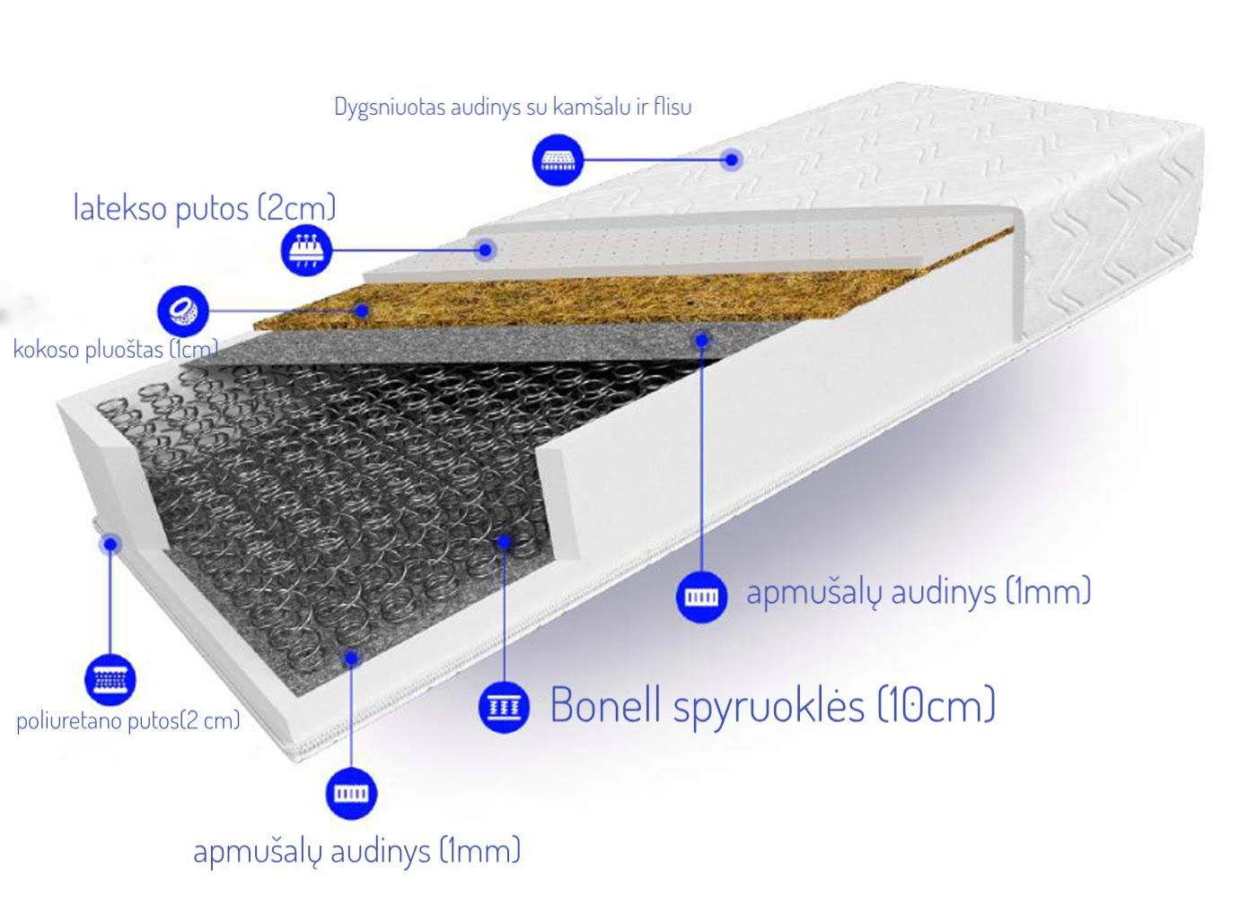 Pagaminta iš natūralių kokosų pluošto. Ji 100% ekologiška, turi antigrybelinių ir antialerginių savybių, gerai išgarina drėgmę ir suteikia čiužiniui reikalingo tvirtumo. - Bonelinė spyruoklių sistema